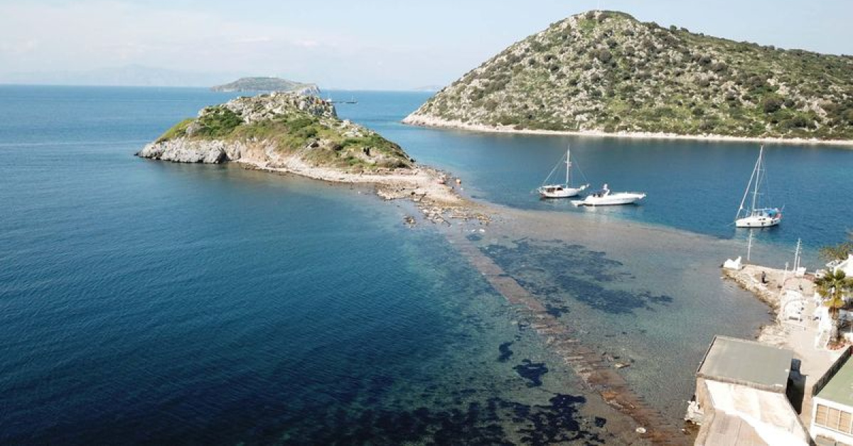 Muğla’nın Bodrum ilçesinde, deniz suyunun çekilmesiyle 3 bin 500 yıllık Myndos kentine uzanan ‘Kral Yolu’ ortaya çıktı. Demirören Haber Ajansı’nın (DHA) haberine göre, Gümüşlük Mahallesi’ndeki Tavşan Adası’na kadar uzanan bu tarihi sur yolları, yılın belirli dönemlerinde gün yüzüne çıkıyor.